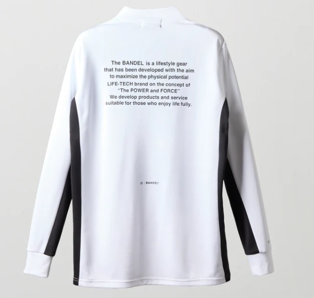 保温性の高い素材を使用し、脇と袖脇を配色で切り替えたモックネックシャツの胸にはバンデルロゴ、背面にはコンセプトノーツをプリントしました。